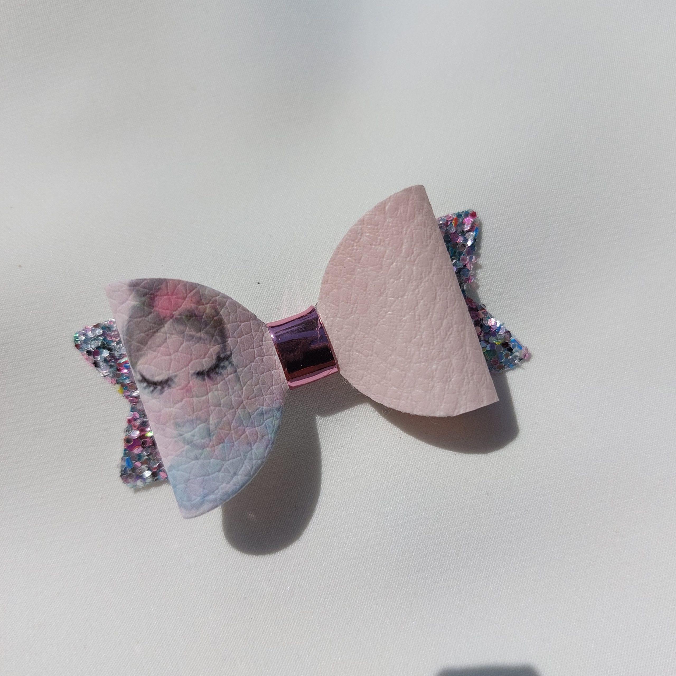 Špangica na krokodilčka s pentljo iz umetnega usnja in bleščic. Velikost špangice je 45mm.