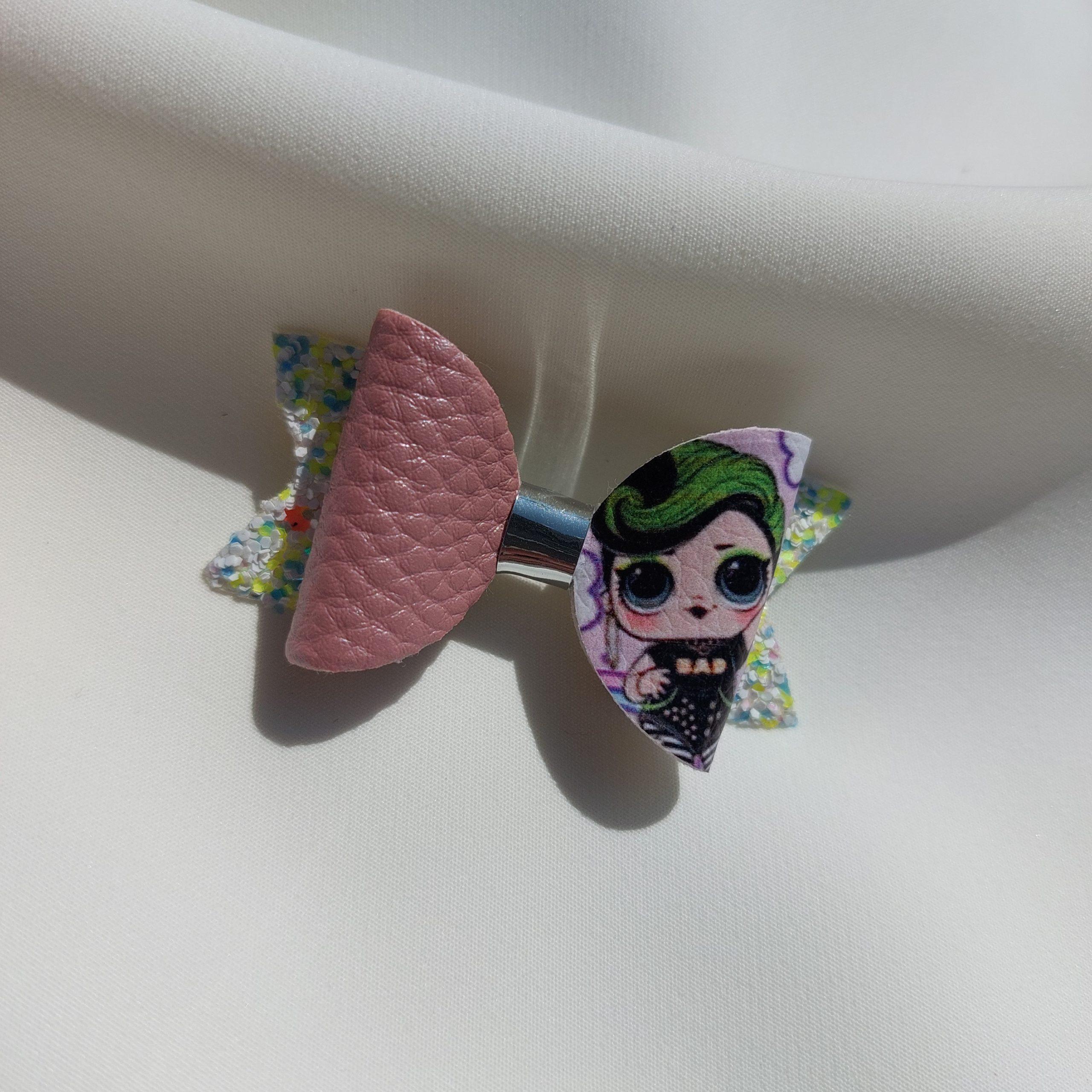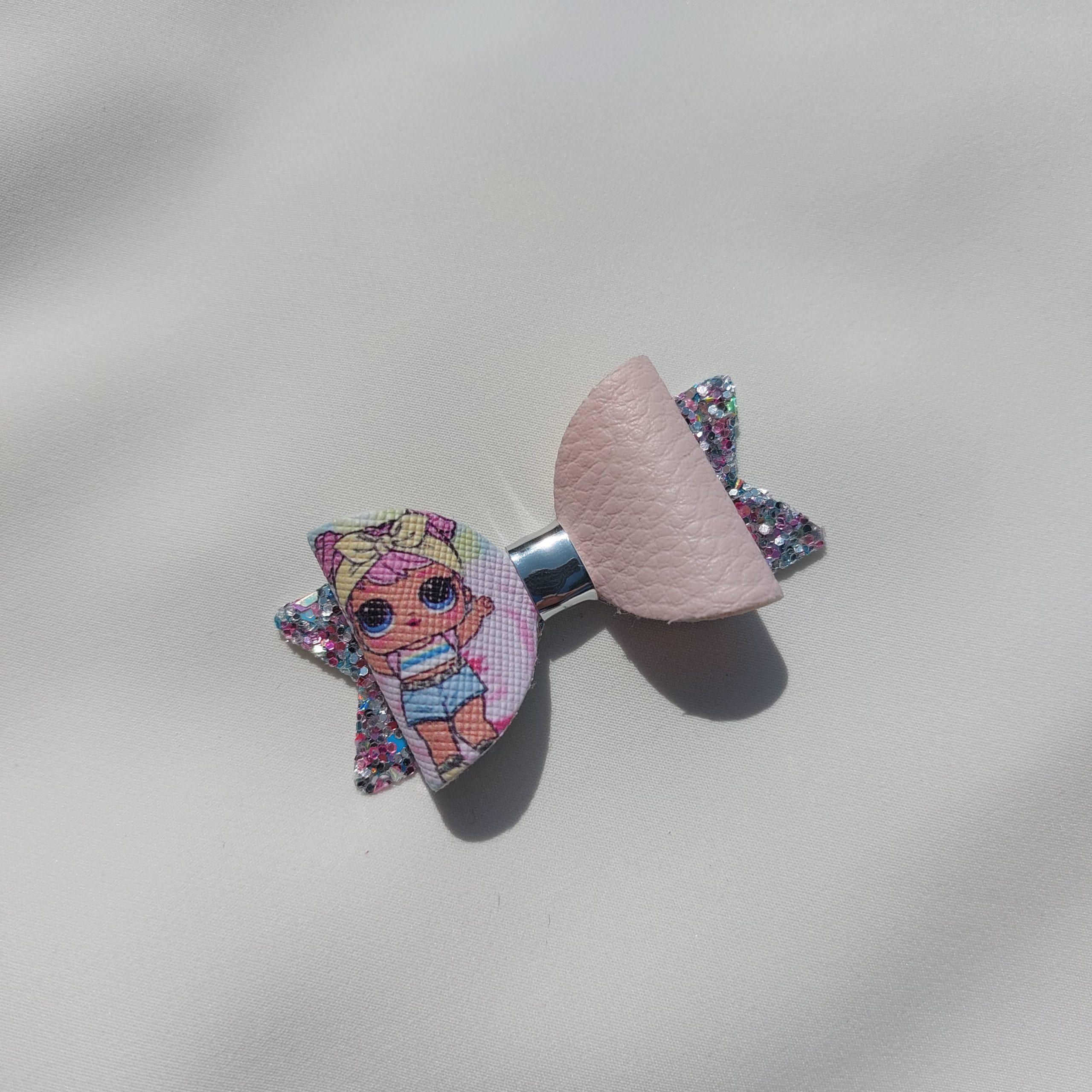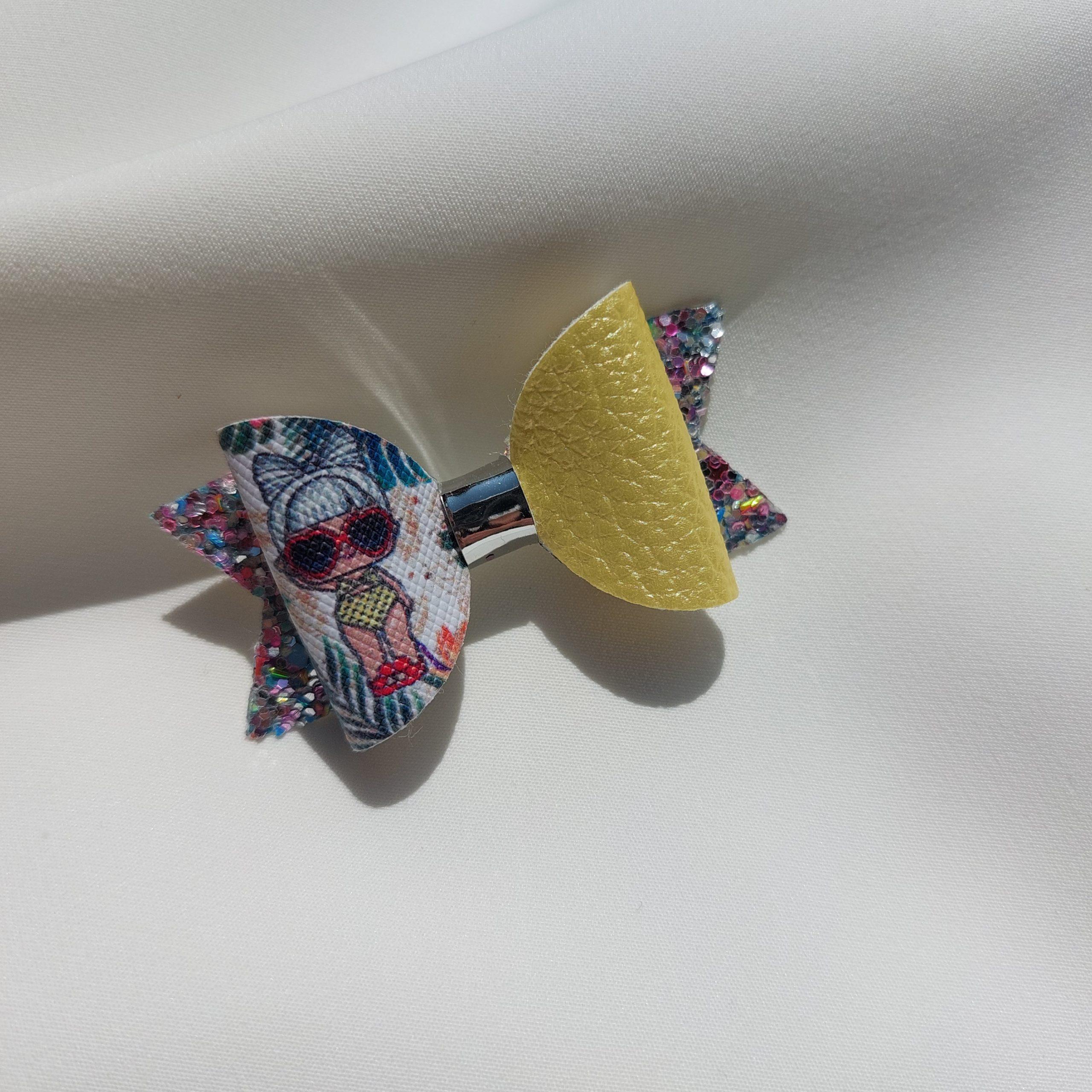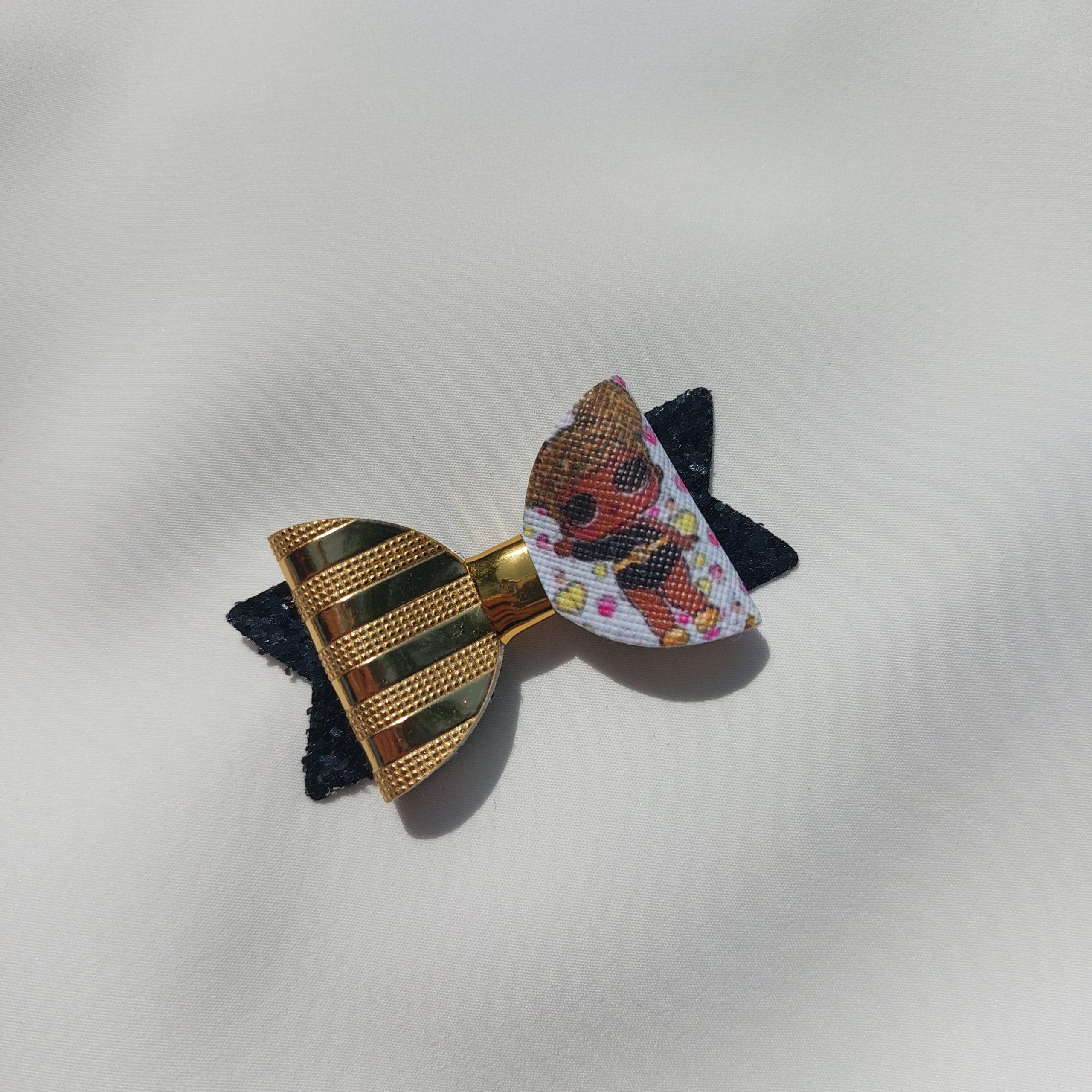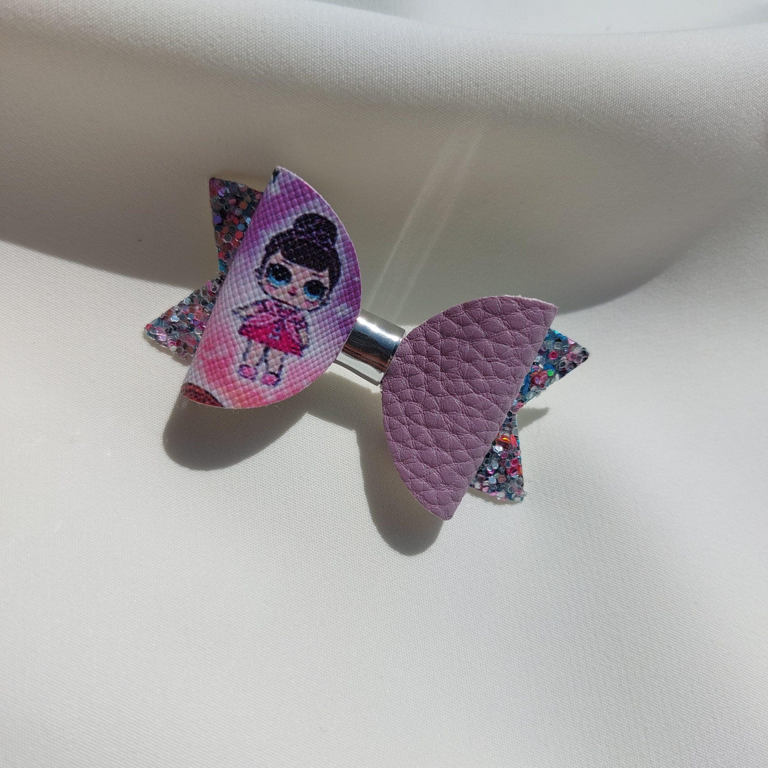 Špangica na krokodilčka s pentljo iz umetnega usnja in bleščic.